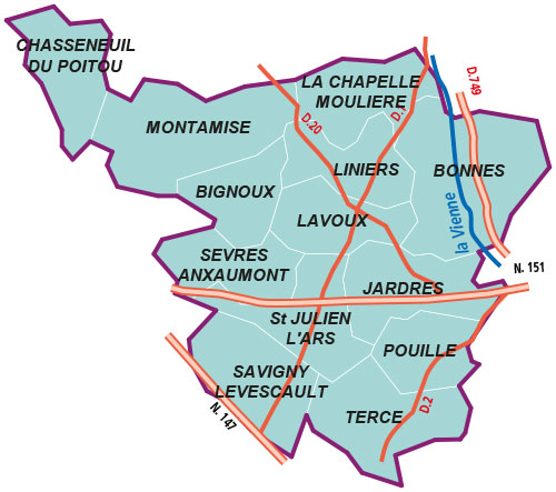Bignoux ~ Bonnes ~ La Chapelle-Moulière ~ Chasseneuil-du-Poitou ~ Jardres ~ Lavoux ~ Liniers ~ Montamisé ~ Pouillé ~ Saint- Julien-l’Ars ~ Savigny-Lévescault ~ Sèvres-Anxaumont ~ Tercé