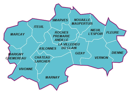 Aslonnes ~ Château-Larcher ~ Dienné ~ Fleuré ~ Gizay ~ Iteuil ~ Marçay ~ Marigny-Chemereau ~ Marnay ~ Nieuil-l’Espoir ~ Nouaillé-Maupertuis ~ Roches-Prémaries-Andillé ~ Smarves ~ Vernon ~ La Villedieu-du-Clain ~ Vivonne