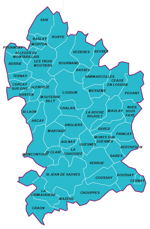 Angliers ~ Arçay ~ Aulnay ~ Basses ~ Berrie ~ Berthegon ~ Beuxes ~ Bournand ~ Ceaux-en-Loudun ~ Cernay ~ Chalais ~ La Chaussée ~ Chouppes ~ Coussay ~ Craon ~ Curçay-sur-Dive ~ Dercé ~ Doussay ~ Glénouze ~ La Grimaudière ~ Guesnes ~ Loudun ~ Martaizé ~ Maulay ~ Mazeuil ~ Messemé ~ Moncontour ~ Monts-sur-Guesnes ~ Morton ~ Mouterre-Silly ~ Nueil-sous-Faye ~ Pouançay ~ Pouant ~ Prinçay ~ Ranton ~ Raslay ~ La Roche-Rigault ~ Roiffé ~ Saint-Clair ~ Saint-Jean-de-Sauves ~ Saint-Laon ~ Saint-Léger-de-Montbrillais ~ Saires ~ Saix ~ Sammarçolles ~ Ternay ~ Les Trois-Moutiers ~ Verrue ~ Vézières